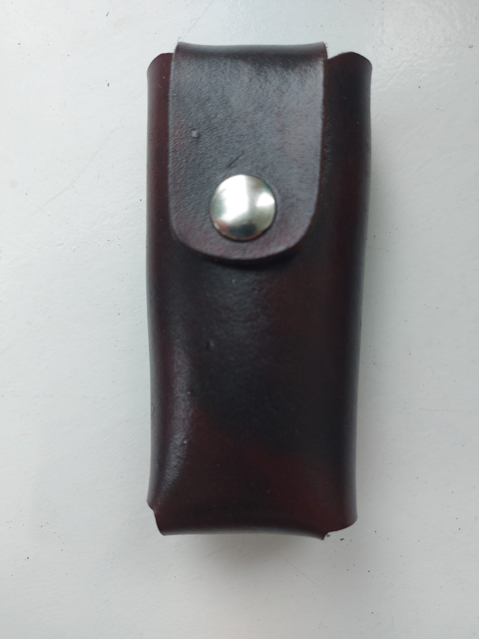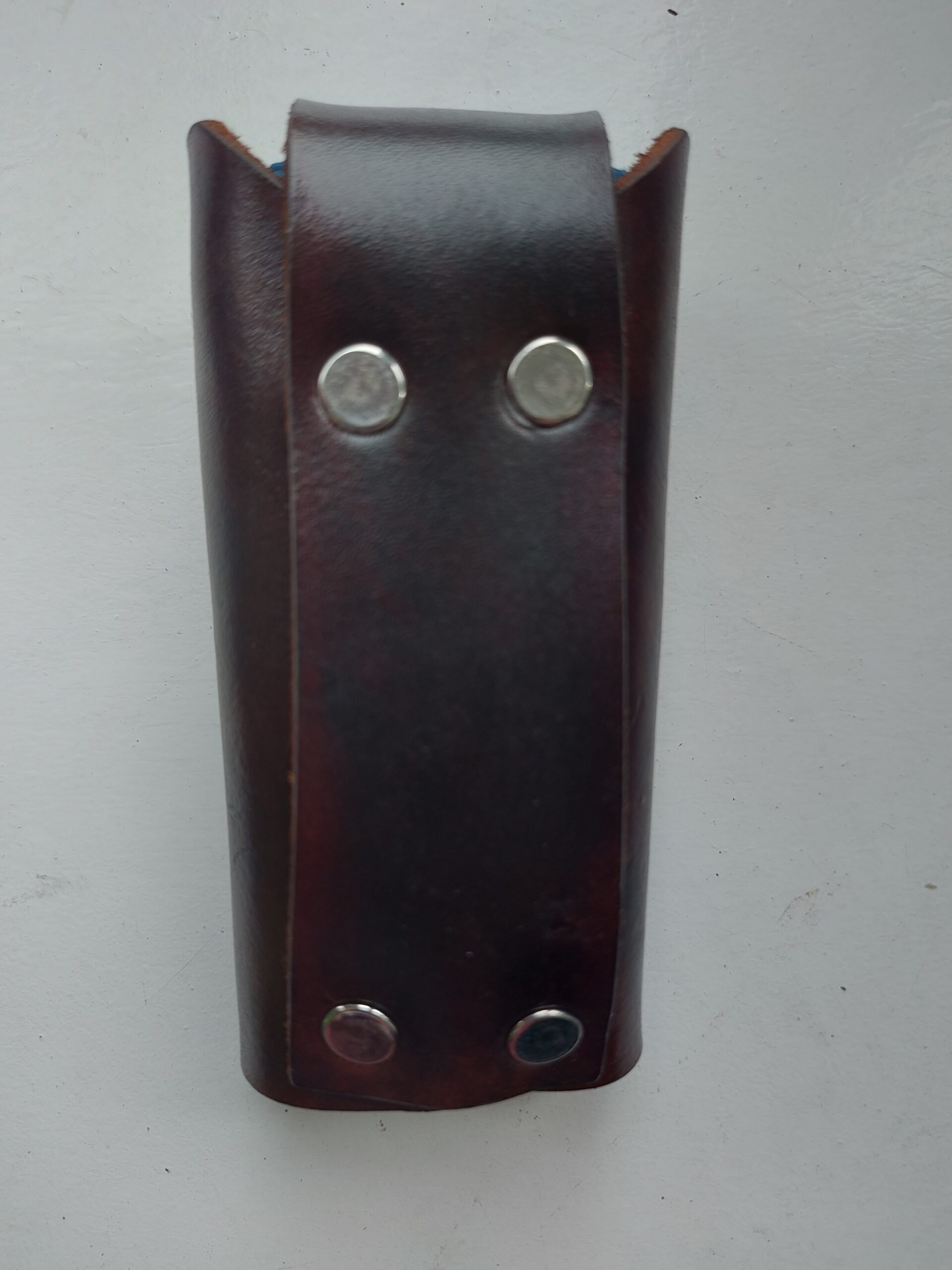 This custom-made leather knife sheath is a perfect accessory for knife enthusiasts. Crafted specifically for a customer, it showcases impeccable craftsmanship and attention to detail. The sheath, fashioned from high-quality leather, boasts a sleek and sophisticated dark brown color, adding a touch of elegance. Practicality meets convenience with the inclusion of a secure snap clip, ensuring that the knife remains firmly in place. Additionally, a belt hoop provides versatility, allowing the sheath to be easily attached to a belt or carried in various ways. This bespoke leather knife sheath combines style, functionality, and durability, making it an ideal choice for any discerning knife owner.
