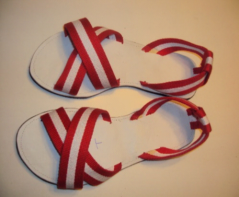 Are made from coloured straps red white and red that represent Canadian colours. They are very strong with a white insole. The bottom is made from rubber.